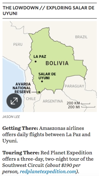 WE WERE HURTLING toward the edge of Bolivia’s Salar de Uyuni salt flat in a Toyota Land Cruiser as the sun was sinking, turning the world from pink to lavender, to a deep, cobalt blue. Our driver was picking up speed, and I could hear the whoosh of the salt crystals spewing out behind us.