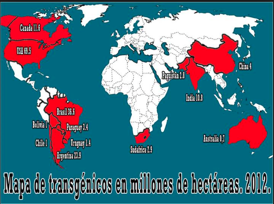 Agriculture, which accounts for about 15 percent of Bolivia’s gross domestic product, is at the center of a controversy over genetically modified crops, with the government limiting the use of transgenic seeds to soybeans and farmers demanding expanded use to increase productivity. [map does not belong to the news article, I got it from the web, GMOs map in million hectares, 2012]
