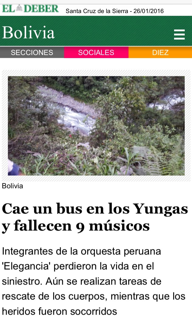 The media reported that the bus was transporting the Peruvian band Elegancia, which had made a tour of Los Yungas.