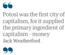 Potosí was “the first city of capitalism, for it supplied the primary ingredient of capitalism – money”, notes the author Jack Weatherford. “Potosí made the money that irrevocably changed the economic complexion of the world.”