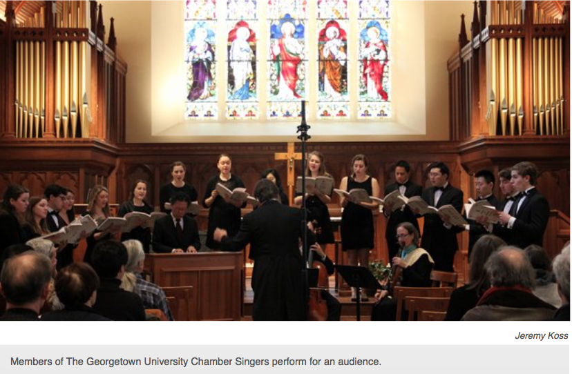 The Georgetown University Chamber Singers have been busy rehearsing music from the early 18th century. It’s not uncommon to sing Baroque music. They do it all the time. But this particular variation on baroque has an unusual backstory. Composed hundreds of years ago in Europe, it found its way to South America in the hands of Jesuit missionaries who taught it to the indigenous people.