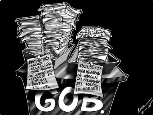 The pending files on the government’s need-to-do’s has on the left side all the “approved: projects that will serve to improve the image of this president. The files on the right are projects on: health, education, bonus for the people with disabilities , job creation, justice, etc.