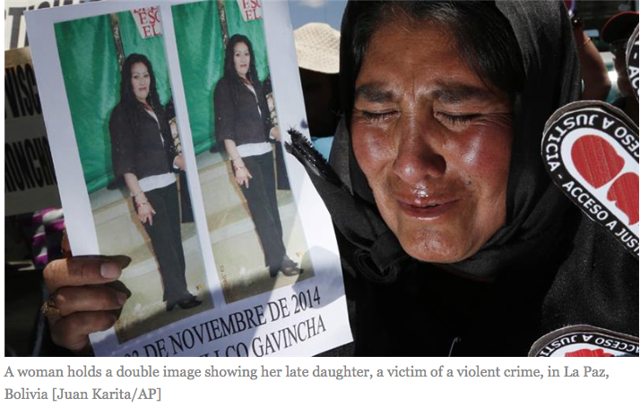 “Though Bolivia has many good laws in place and has signed numerous human rights treaties, it’s culture lags far behind its legal framework,” de Angulo said. It is a culture that takes a woman’s life every three days.