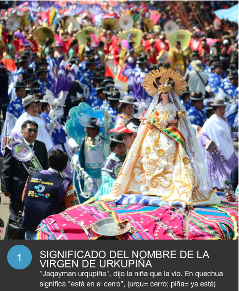 1 Significance of the name of the Virgin of Urkupiña: the girl that saw her, said in Quechua “is in the mountain”.