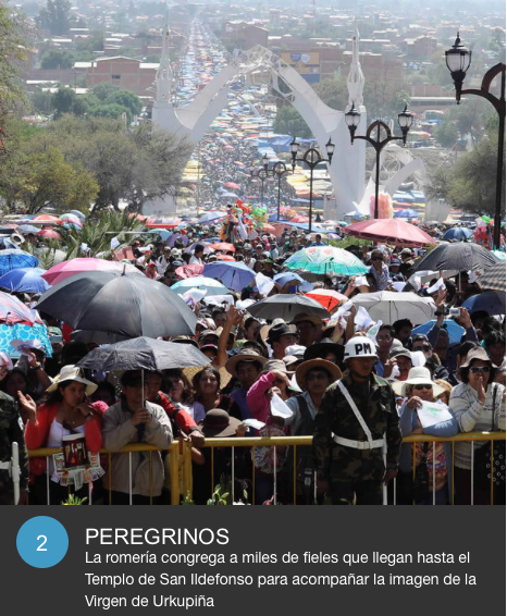 2 Pilgrims: the pilgrimage composes of thousands of devouts that arrive to the San Ildefonso Temple to accompany the image of the Virgin of Urkupiña.