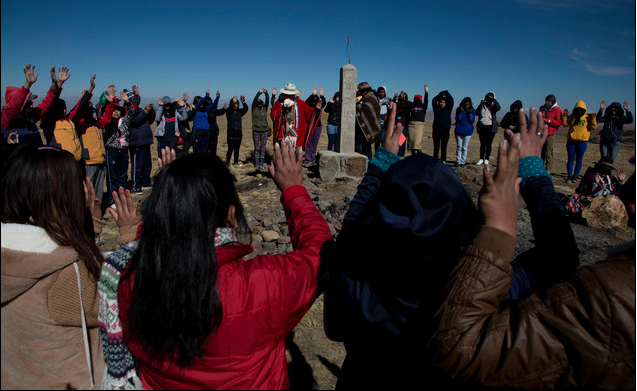 A group of “amautas,” or spiritual guides, arrives to leave offerings to Pachamama, the Mother Earth figure in indigenous Aymara mythology. Women chew coca leaves to ward off the effects of high altitude and mumble prayers beseeching favors, while two priests circle the post and touch it with seashells to summon the spirits.