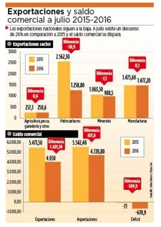 Oil exports through July reached only $1,258.8 million, 50.9% less (see chart) than the same period of 2015. The value of shipments of natural gas to Brazil and Argentina decreased by 50%.