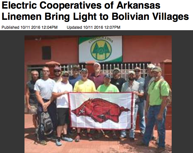 Beni, Bolivia, Energy, Environment Arkansas people help bring light to Guayaramerin population Posted by Bolivian Thoughts on October 15, 2016October 13, 2016 Arkansas Matters reports: . . http://www.arkansasmatters.com/news/local-news/electric-cooperatives-of-arkansas-linemen-bring-light-to-bolivian-villages Rate this:Share this: Click to share on Facebook (Opens in new window) Facebook Click to share on LinkedIn (Opens in new window) LinkedIn Click to print (Opens in new window) Print Click to share on Telegram (Opens in new window) Telegram Click to share on X (Opens in new window) X Click to share on WhatsApp (Opens in new window) WhatsApp Click to email a link to a friend (Opens in new window) Email Like Loading... Related Published by Bolivian Thoughts Senior managerial experience on sustainable development projects. View all posts by Bolivian Thoughts