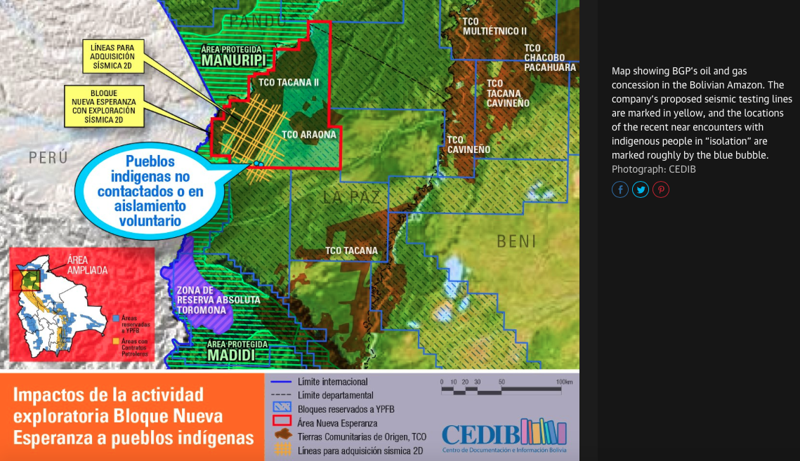 Neither BGP nor YPFB responded to questions from the Guardian, but on 17 October Bolivian newspaper Los Tiempos reported YPFB’s president, Guillermo Achá, “denying the existence of supposed uncontacted indigenous people in Bolivia’s Amazon” and saying oil and gas operations will continue as planned.