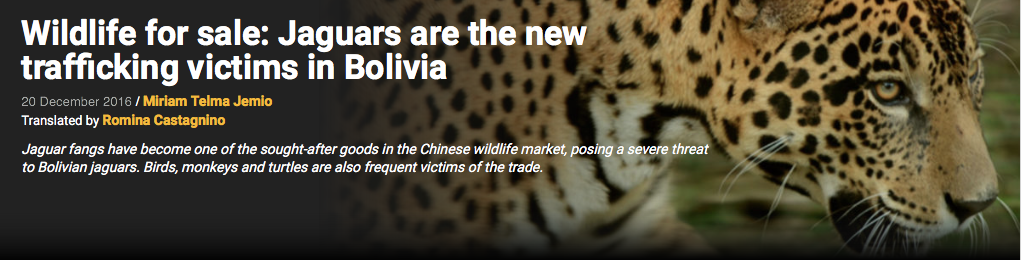 The most serious of these recent trends in trafficking is the illegal trade in jaguar fangs for the Chinese market. Between 2014 and 2016, 337 fangs were seized. Authorities estimate that at least 87 cats were killed two areas alone: Madidi National Park and the Pilón Lajas Biosphere Reserve and Communal Lands, both in the northern department of La Paz.