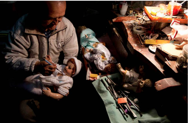 In this Dec. 14, 2016 photo, religious statue restorer Roberto Ramos retouches a ceramic infant Jesus doll at his workshop in La Paz, Bolivia. At his tiny workshop, inside an old house in the center of La Paz, dozens of figurines with mangled fingers, dead eyes, haggard faces and dusty hair arrive for him to revive in time for Christmas. Juan Karita AP Photo