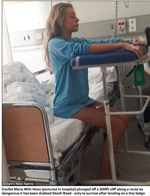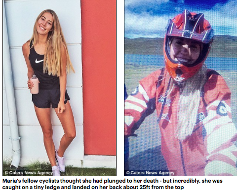 Her fellow cyclists thought she had plunged to her death – but incredibly, she was caught on a tiny ledge and landed on her back about 25ft from the top.