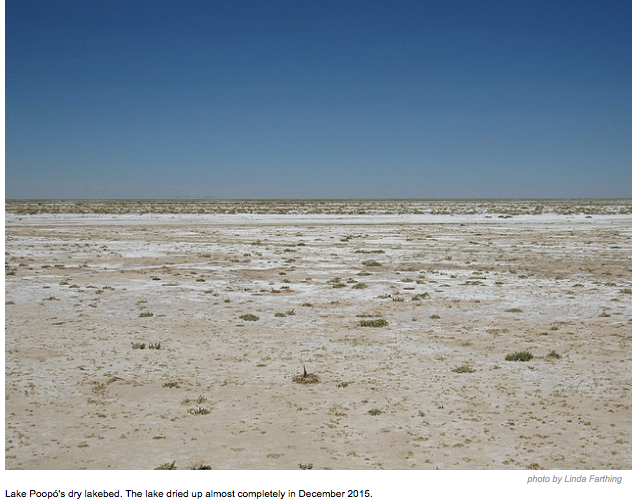 Immediate responsibility for the dry lake, however, lay with the recurring El Niño weather pattern, which heats up the Pacific Ocean, amplifying temperatures over land. “Lake Poopó is the victim of a perfect storm of El Niño and climate change,” Jim Shultz from the Cochabamba-based Democracy Center said via email.