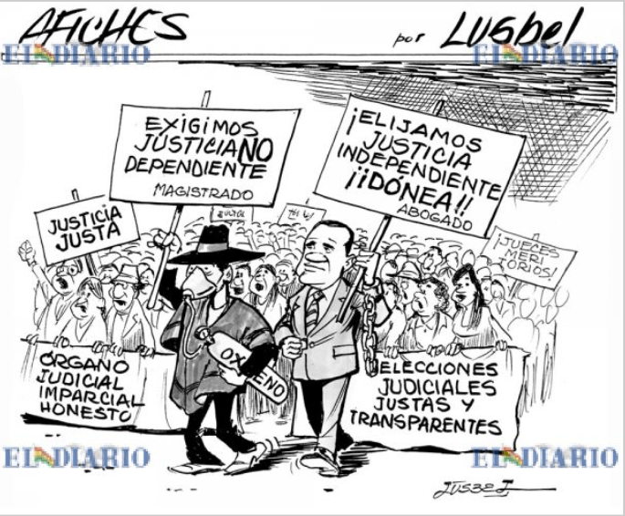 This cartoon from El Diario, depicts the seriousness of the lack of an independent Justice System in Bolivia, it has been compromised by the Executive power and is completely functional to the ruling party.