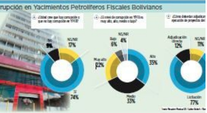 The company also asked respondents how they rated the level of corruption in YPFB, 35% considered the level of oil corruption is “high”, 33% rated it “medium” and 22% said “very high” 6% said that the level of corruption in Yacimientos is “low”.