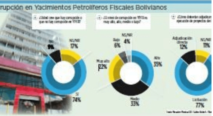 Before the query: Do you believe that there is corruption or that there is no corruption in YPFB?, 74% said yes, while 9% said that there is “no” corruption in the Bolivian state oil company. Of all respondents, 17% said they did not know or preferred not to respond to the Markets and Samples consultation.