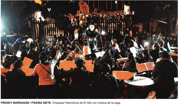 About 100 members of the band from the Litoral de Caracollo school (Oruro) participated in the event, wearing disguises of imperial soldiers; Appeared another 50 people of the Philharmonic Orchestra of El Alto and the fan club of the saga.