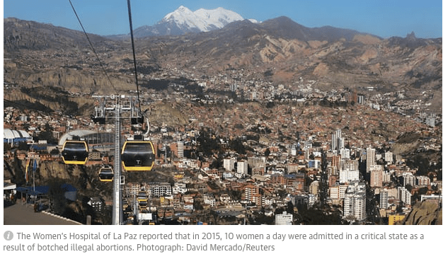 The Women’s Hospital of La Paz reported that in 2015, 10 women a day were admitted in a critical state as a result of botched illegal abortions. Underground abortions are the third most prevalent cause of maternal mortality, according to the Bolivian ministry of health. This contributes to a maternal mortality rate that the World Health Organisation puts at the second highest in South America at 206 per 100,000 – 23 times that of the UK.