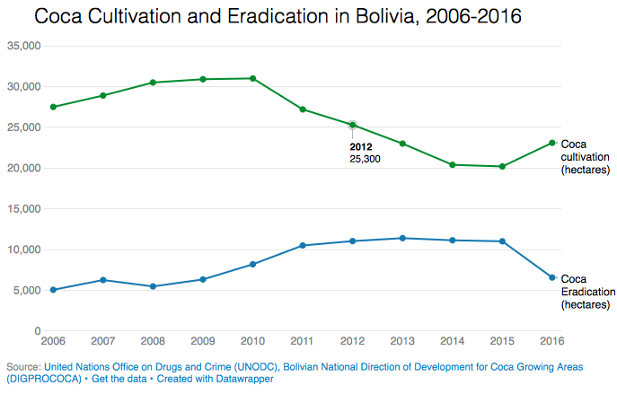 The main question now is whether Bolivia is set to continue to increase its coca cultivation in 2017, especially given the government’s decision earlier this year to raise the legal limit for coca cultivation from the historic 12,000 hectares set in 1988 to 22,000 hectares.
