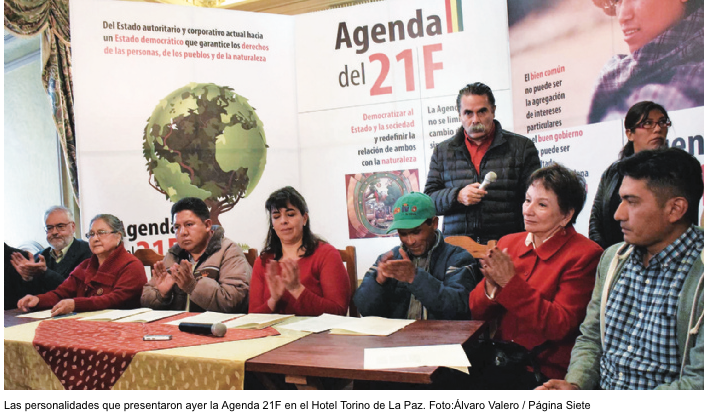 In addition to this activist, among those who signed Agenda 21F are Gloria Ardaya, Jorge Lazarte, Guillermo Mariaca, Cecilia Requena, Erika Brockmann, Enrique Velazco, Alfonso Gumucio and Carla Casas.