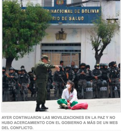 Bolivian Thoughts opinion: Ever since evo began his political life, we can acknowledge that his egocentrism has reached the limits of a rude egocentric autocrat. As such, the negotiations that the physicians try to carry out with this government, appear to repeat other ordeals like the TIPNIS and of the disabled … so, I would only ask these brave group of professionals not to give in. This inept government must abolish this absurd norm!