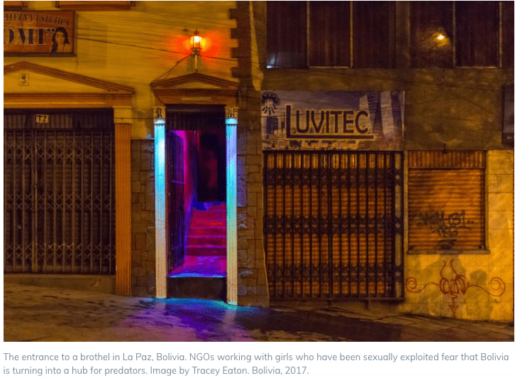But the workers at the Munasim Kullakita Foundation say they see a growing number of young women and girls subjected to commercial sexual exploitation. Bolivia is turning into a hub for sexual predators, they say, and the worry is that the country will soon join Colombia, Peru and Brazil as one of Latin America’s leading destinations for sex tourism.