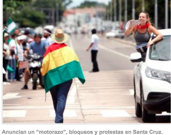 The spokesman of the Coordination for Democracy of Santa Cruz, Víctor Hugo Valda, announced that for this Friday a motorcade of motorcycles and vehicles called “motorazo” and march of torches, in addition to protests in the precarnavaleras of Saturday in defense of the results of February 21 and the Political Constitution of the State.