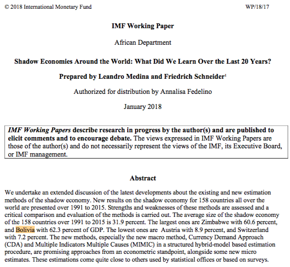 Bolivian Thoughts opinion: This study, “cleverly” avoids making references or assigning relevance to narcotrafficking and smuggling which for Bolivia are the largest sources of cash. It is worthy remembering that when a demagogue offers second Christmas bonus to workers, is neglecting the largest portion of Bolivian employees, thus, it is plain demagogue and misleading when the world listens the official reports from this autocratic and ochlocrat government.