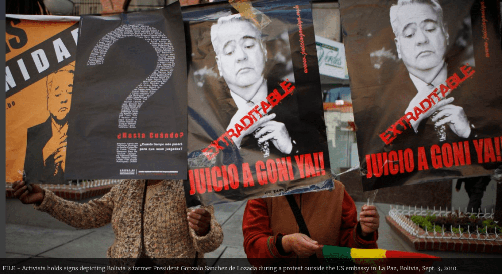 The federal case against former President Gonzalo Sanchez de Lozada, and his former defense minister, Jose Carlos Sanchez Berzain, has been pending since 2007. It was brought by families of eight people shot and killed under the Torture Victim Protection Act, which authorizes lawsuits in the U.S. for extrajudicial killings in foreign countries.