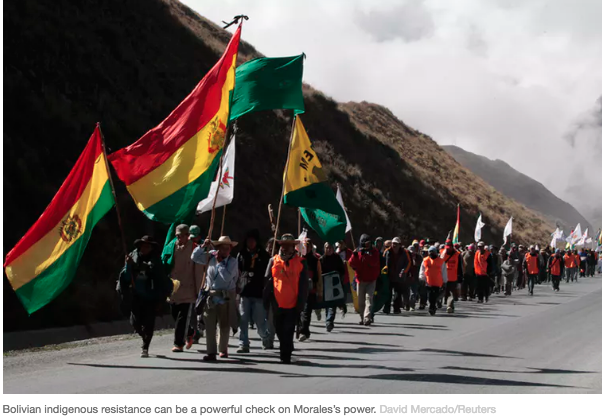 In 2011, Morales was forced to abandon plans to build a highway through a national park occupied by indigenous communities after over 1,000 local residents undertook a 360-mile protest march to Bolivia’s capital. They were violently repressed by police along the way. [Bolivian Thoughts opinion: evo wanted to expand the coca crop acreage by stepping in the TIPNIS, he always says he is first the leader of the coca growers of the Chapare and then, only then the president of Bolivia … so his allegiances, his loyalty is clearly defined!]