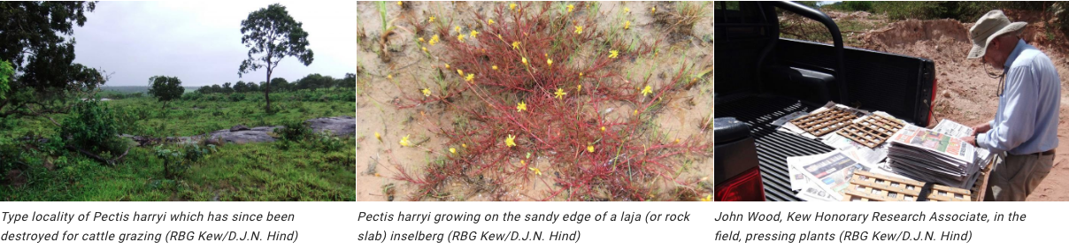 Kew Scientists are working on a programme to identify areas within Chiquitania that hold concentrations of rare and/or unique plant species. The need to identify, study and protect this unique, threatened geographic region comes as it is experiencing extensive threats from land use change for activities including agriculture, logging, mining and road building. An example of a species that has undergone a significant habitat loss is this member of the daisy family, Pectis harryi. It is only found on lajas (rock slab inselbergs) within the Chiquitania. This species was only known from this locality, which has now been largely destroyed by agricultural machinery, which cleared the vegetation for cattle grazing and the construction of a major road.