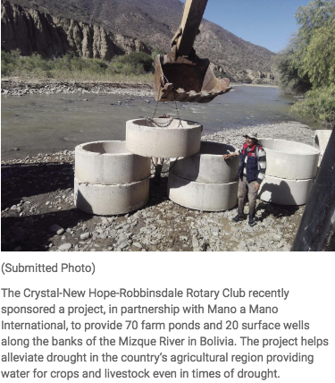 Jim Benshoof, a Crystal resident and director of international service for the club, said local officials in Bolivia requested help from the Mano a Mano International organization to help alleviate the problem through the construction of farm ponds and surface wells along the river’s edge.