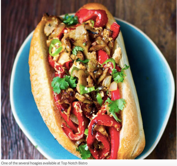 Several sandwiches on the menu are made for splitting and sharing. There’s the beef medallion sandwich with pan-fried onions on a soft Portuguese bun. The Top Notch steak with salad and cheese is served on a baguette. The Philly chicken cheese in a hoagie is another favorite.