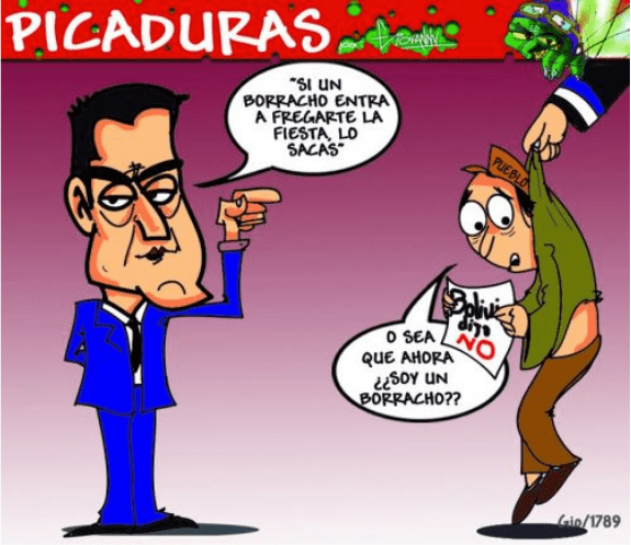 This one reflects the interpretation Javier Zabaleta, that any one who defends the results of the Referendum of February 21, 2016, should be handle as any drunk crashing into a party. And the people, holding the sing “Bolivia said NO,” says “that is, now I am a drunk??”