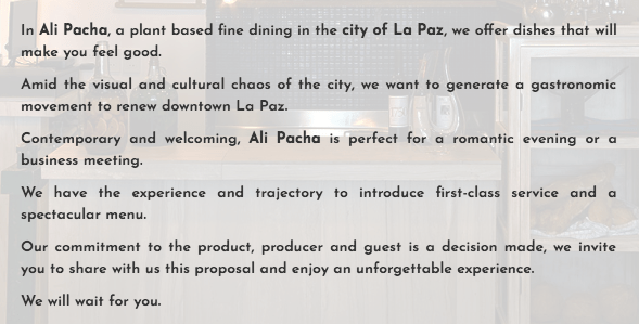 Vegan in Bolivia has caught up very fast, specially among Millennia’s. One of my dearest daughters lives overseas and when she comes, finds it hard to find vegetarian places to eat, let alone vegan, when visiting Bolivia. I’m sure she and her hubby will find this place delicious! Kudos to Ali Pacha! The above is the opinion of Bolivian Thoughts.