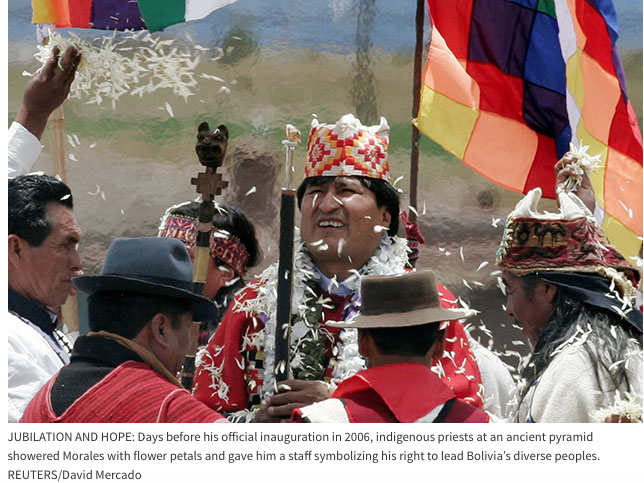 For Bolivia’s more than 4 million indigenous people, support for Morales appeared to pay off. The poverty rate dropped from 59.9 percent in 2006 to 36.4 percent last year. Access for indigenous communities to electricity, sewerage and water service all grew, according to the World Bank. [Bolivian Thoughts opinion: Paper accepts anything, he ordered that INE manipulates the data to record GDP, macroeconomics figures to appear some “success.” He pushed several bonuses that are demagogue and NOT self sustained, so that poverty levels could go back again, harder than before. There is liquidity in country, as a result of money laundering from the narcotrafficking and the smuggling of goods. It is just a mirage, like you see Brazil with Lula/Dillma; Venezuela with Chavez/Maduro; Ecuador with Correa, Nicaragua with Ortega, the Kirchners of Argentina … they all applied the same recipe, to control all state powers and engage in corruption. Socialists of the 21st century have proven to be the worst corrupt politicians ever!]