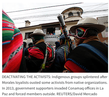 One rainy evening in December 2013, MAS activists broke down the door of the two-story La Paz headquarters of Conamaq, as the other indigenous rights group is known. Once inside, they forced members, some of whom were visiting La Paz from remote regions and living there during their stay, to leave.