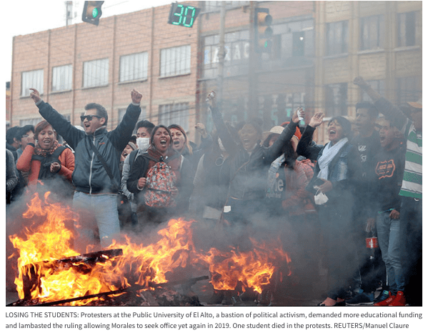 Early last year, students at the Public University of El Alto, a bastion of political activism, began demonstrating for more educational funding. The ruling on term limits sparked further discontent, fueling demonstrations that continued into this year.