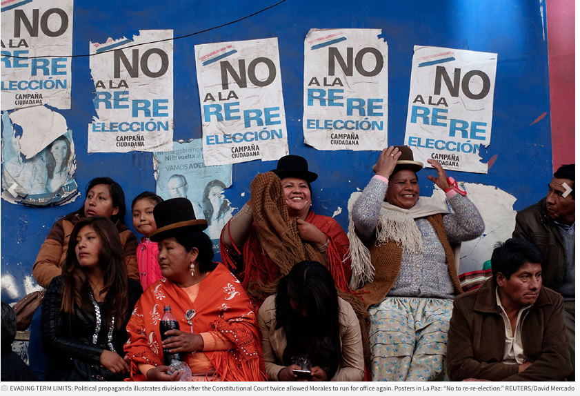 Although his own 2009 constitution set a limit of two five-year terms, Morales asked voters in a 2016 referendum to let him run again in 2019. When they said no, Morales convinced the Constitutional Court to let him anyway. The court, consisting of jurists nominated by Congressional allies, ruled that term limits are a violation of his “human rights.”