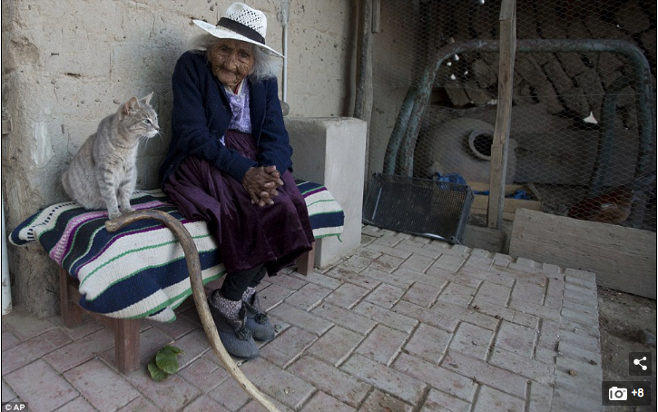 Incredible life: Julia Flores Colque, who will turn 118 in October, sits with her cat ‘Minina’ outside their home in Sacaba, Bolivia