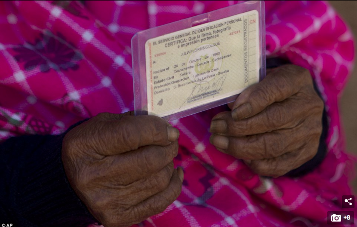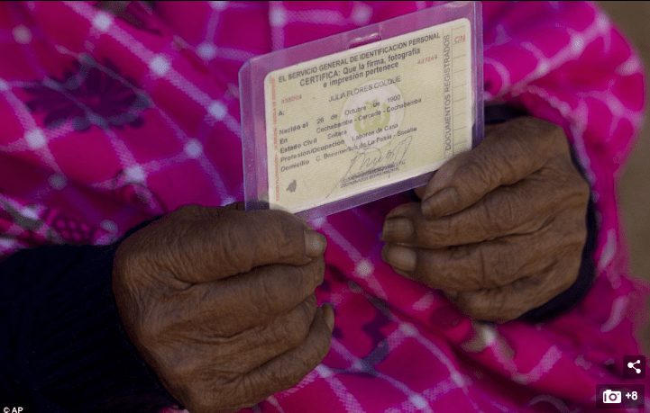 Proof: Ms Flores Colque’s national identity card says she was born on October 26, 1900 in a mining camp in the Bolivian mountains