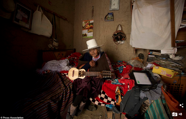 The centenarian still plays a charango, a small Andean stringed instrument, as she sits on a bed in the family home