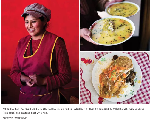 Formerly a chef at a reputable Indian restaurant in La Paz, Mamani has taught hundreds of men and women who sometimes travel upwards of two hours each way to attend. Thus far, 3,500 students have graduated from Manq’a, 70 percent of whom have been women. About 150 students have gone on to start their own businesses, 60 percent of these opened by women. Soon, Mamani will be opening Manq’a’s first school in Sucre, Bolivia’s second capital city. “This place always feels like family,” Mamani says. “I’m grateful that Manq’a has trusted me from the beginning.”