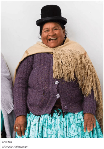 A name for indigenous Bolivian women (altered from the Spanish chola, which carries a derogatory connotation), cholitas are today highly visible on the streets of El Alto and La Paz. Many wear bowler hats (whose style, brand, and adornment with jewelry or brooches often indicate economic status), tiered skirts, long braids, and many-colored shawls, which they use to carry children or packages. Some women opt to have their teeth enrobed in or replaced with gold, a trend that denotes wealth. Cholitas, who were once considered lower-class citizens and not even allowed to occupy some squares and gathering places, now hold public office, own businesses, perform in their own wrestling league, and host radio and television shows. Though his clench on power has drawn criticism and concern, President Evo Morales—the first indigenous person elected to office—is often credited with renewing pride in Bolivia’s indigenous people and traditions.