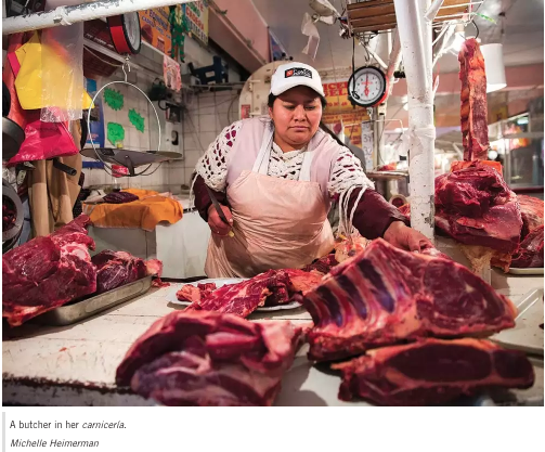 Along the winding streets of La Paz,through a hidden alleyway and down a dim market corridor, a butcher wields a cleaver, bringing it swiftly down upon a glistening slab of scarlet beef. Another butcher lifts a swollen aubergine heart, nestling it carefully atop a heap of other hearts. Yet another lays medallions of blushing pink pork along a stall window as if arranging gemstones at a jeweler’s counter. A fourth smiles warmly through a curtain of mottled sausages, her teeth enrobed in gold, a bowler hat tilted back upon the crown of her head.