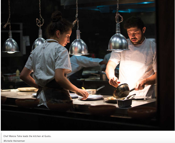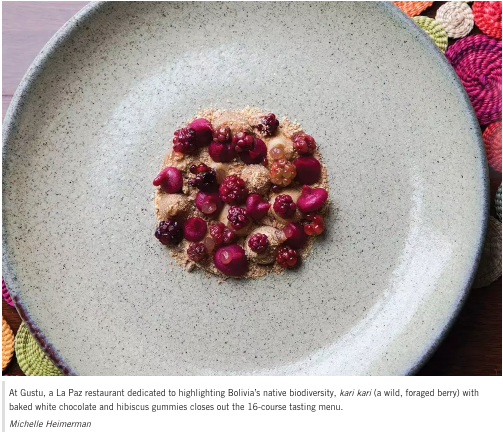 Tall and lithe, her face glowing beneath industrial lights, Marsia Taha strides to the pass with anticuchos—in this case, thinly sliced beef heart skewered to tiny potatoes—that have been seared atop a sizzling pink salt rock. A native Bolivian, Taha is the head chef at Gustu, the unlikely World’s 50 Best–nominated restaurant that opened in 2013. In many ways, Gustu put Bolivia on the map as a rising food destination, illuminating the country’s untapped culinary potential and biodiversity. Taha has been there from its beginning. After working at both Studio and Geist, two lauded restaurants in Copenhagen, she returned home to La Paz to work as a sous chef.