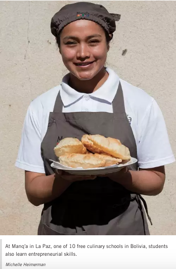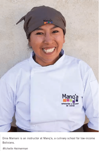 Formerly a chef at a reputable Indian restaurant in La Paz, Mamani has taught hundreds of men and women who sometimes travel upwards of two hours each way to attend. Thus far, 3,500 students have graduated from Manq’a, 70 percent of whom have been women. About 150 students have gone on to start their own businesses, 60 percent of these opened by women. Soon, Mamani will be opening Manq’a’s first school in Sucre, Bolivia’s second capital city. “This place always feels like family,” Mamani says. “I’m grateful that Manq’a has trusted me from the beginning.”