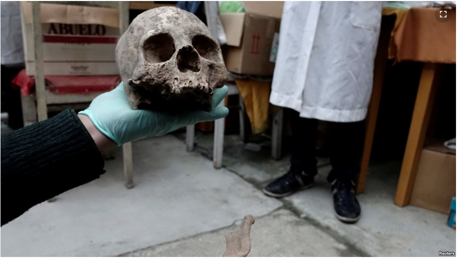 Archeologists show a skull as part of an archeological finding, dated approximately 500 years ago, in Mazo Cruz, near Viacha, Bolivia, Nov. 12, 2018.