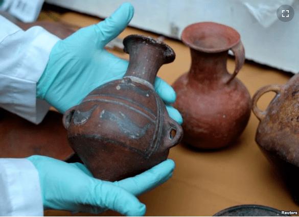 Ceramic pieces are displayed as part of an archeological finding, dated approximately 500 years ago in Mazo Cruz, near Viacha, Bolivia, Nov. 12, 2018.