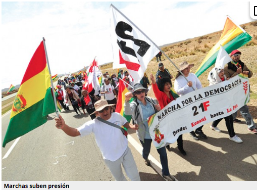 The marchers wear white shirts, some have stamps 21F, in reference to that referendum, and flutter national flags and posters with the slogan “Bolivia said no”.